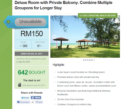 Tetiba, Qimie pon bersuara (sambil mengusap2 janggut yang baru di kaler dengan warna hitam -_-, ) “Eh, dekat GroupOn ader promotion nak pergi bercuti ke Cherating for 2day 1night dekat holiday villa RM150 untuk dua orang. Maka sorang kena bayar RM75”
